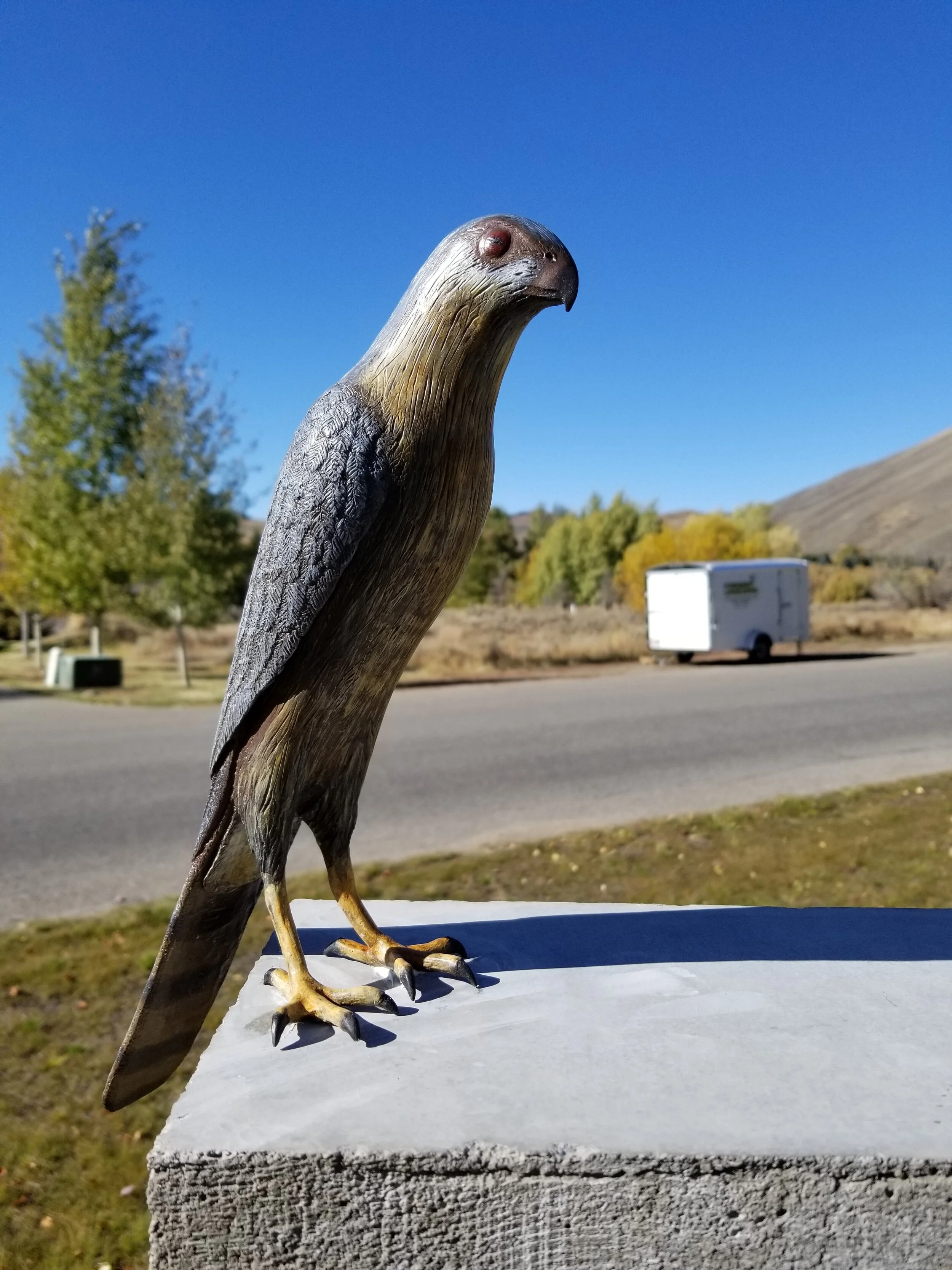 Life size bronze Coopers Hawk. Sculpted in clay and cast in bronze by Blue Mountain Fine Art. It stands 10 inches tall from the feet to the top of its head. 16 inches from the end of tail to tip of beak. The feet are threaded for mounting. 7/10 through 10/10 available and made to order.