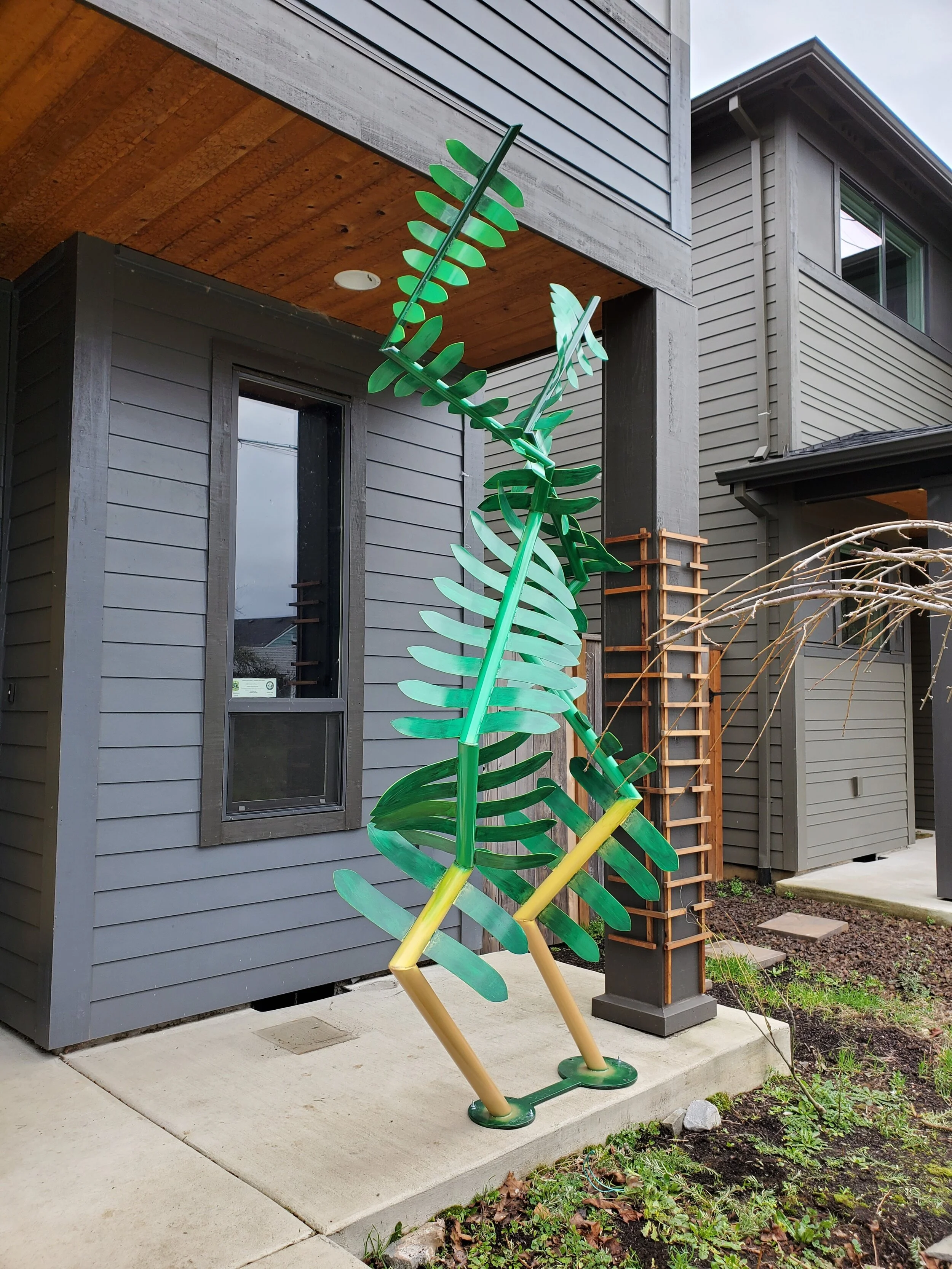 Twisted Bamboo zigzagging and twisting up 9 feet tall. Welded to a 1/2 inch plate it starts with 2 1/2 inch tubing and tapers up to 1 inch tubing. The 14 gauge metal leaves twist and get smaller as they go up. The sculpture is painted to give the affect of different levels of bamboo growth and clear coated.